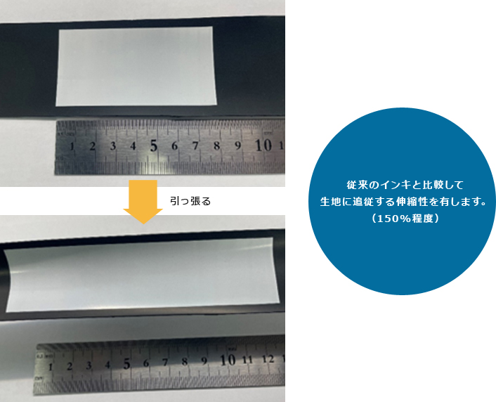 また、伸長性も良好で破断することなく150%程度の伸びがあり、ゴムの伸縮への追従性に優れています。